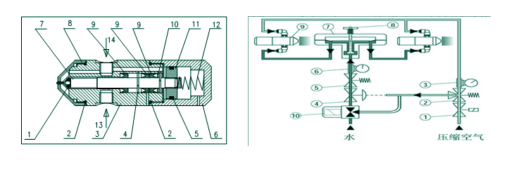 具有自动清除水垢和积尘、防止滴水功能的气动针阀如图1所示,喷嘴雾化装置由喷嘴基座、前盖、后盖、喷嘴阀芯(气动针阀)、活塞以及若干个密封圈组成,前盖设置在喷嘴基座的前端,其上开有出水口,后盖设置在喷嘴基座的后端,喷嘴阀芯安装在喷嘴基座的空腔内,喷嘴阀芯的后端还安装一活塞,该喷嘴阀芯的后端与后盖之间还设置有压缩弹簧,前端装有“O”型密封圈;喷嘴基座上还设置有水路和气路,水路连通到喷嘴基座的空腔内,气路的一路连通到所述喷嘴基座的底部,另一路连通到喷嘴基座的顶部。喷嘴阀芯的前端还设置一与所述前盖上的出水口相配的细针当压缩空气从进气口14 进入喷嘴后,一路从喷嘴前端喷出,同时推动喷嘴内的气动活塞带动针阀向后移动,将出水口打开。利用虹吸原理,在水路通道内产生真空,将水通过进水口13 吸入喷嘴内,并从出水口喷出,被空气雾化。利用压缩空气的通断,可以控制喷嘴阀芯(即气动针阀)的往复运动,喷嘴阀芯前端与前盖上的出水口相配的细针可以将出水口的水垢和积尘迅速的清除掉。当压缩空气断开或气压低于0.2MPa时,喷嘴阀芯在尾部弹簧力的作用下,立即将出水口密封,滴水不流。